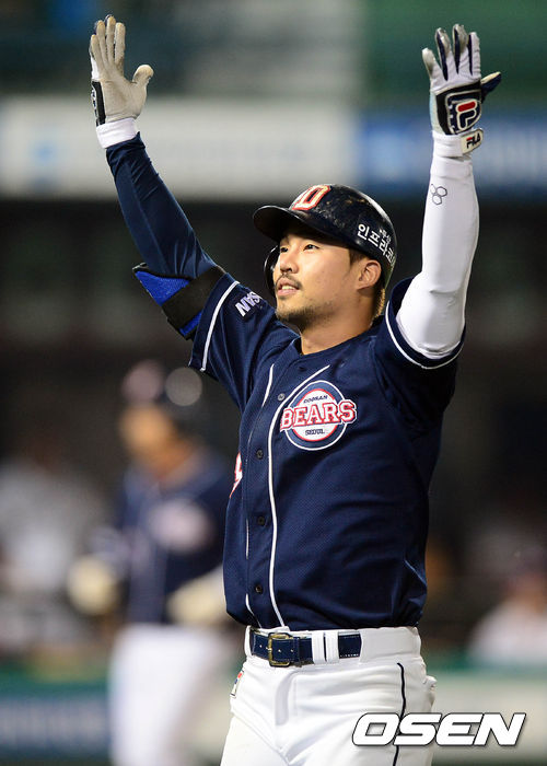 14일 오후 서울 목동구장에서 열린 '2013 한국야쿠르트 세븐 프로야구' 준플레이오프 5차전 넥센 히어로즈와 두산 베어스의 경기 13회초 2사 1,2루 오재원이 스리런포를 치고 환호하고 있다.