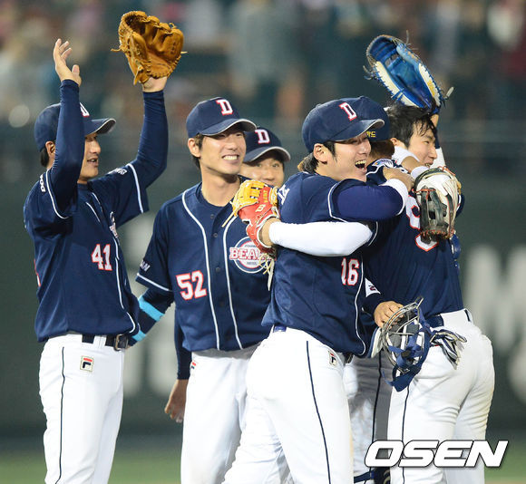 14일 오후 서울 목동구장에서 열린 '2013 한국야쿠르트 세븐 프로야구' 준플레이오프 5차전 넥센 히어로즈와 두산 베어스의 경기 종료 후 두산 선수들이 승리를 기뻐하고 있다.