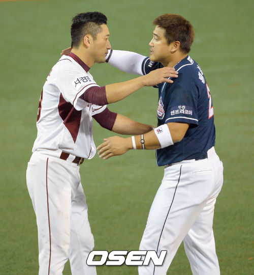 경기 종료후 넥센 이택근과 두산 홍성흔이 포옹을 하고 있다./ajyoung@osen.co.kr