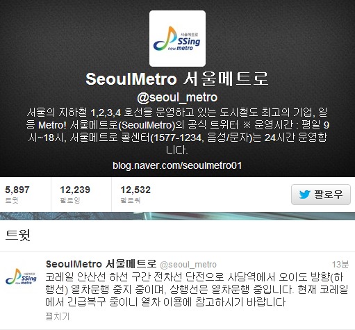 서울메트로는 15일 오전 공식 트위터를 통해 "코레일 안산선 하선 구간 전차선 단전으로 사당역에서 오이도 방향(하행선) 열차운행 중지 중이며, 상행선은 열차운행 중입니다. 현재 코레일에서 긴급복구 중이니 열차 이용에 참고하시기 바랍니다"라고 공지했다.