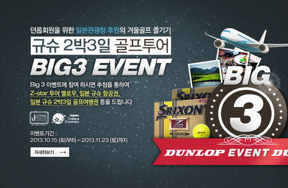 던롭스포츠코리아(대표 홍순성)는 일본관광청 후원으로 일본 큐슈 골프투어 상품권 및 항공권을 제공하는 '던롭코리아와 일본관광청이 함께 하는 Big3 이벤트'를 던롭코리아 홈페이지(http://www.dunlopkorea.co.kr)에서 진행한다.