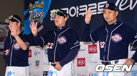 15일 오후 서울 잠실구장에서 진행된 '2013 한국야쿠르트 세븐 프로야구 플레이오프 미디어데이'에서 김진욱 감독, 홍성흔, 유희관이 플레이오프 4차전까지 예상하고 있다.