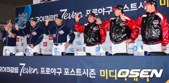 15일 오후 서울 잠실구장에서 진행된 '2013 한국야쿠르트 세븐 프로야구 플레이오프 미디어데이'에서 양팀 선수들이 포즈를 취하고 있다.