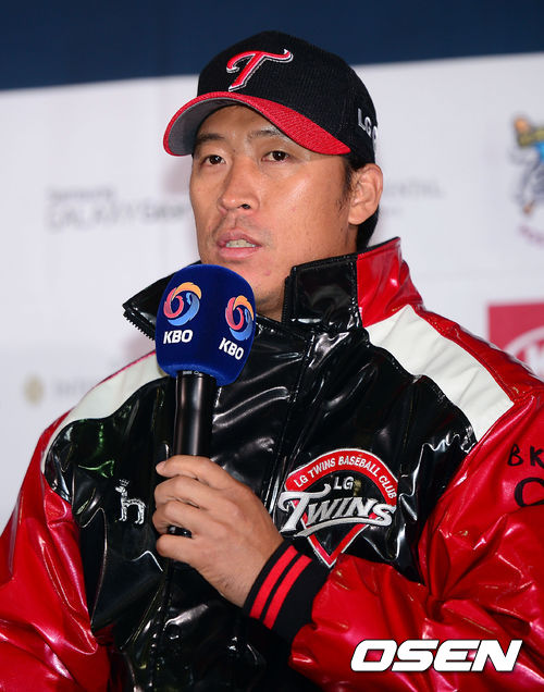 15일 오후 서울 잠실구장에서 진행된 '2013 한국야쿠르트 세븐 프로야구 플레이오프 미디어데이'에서 이병규가 출사표를 던지고 있다.