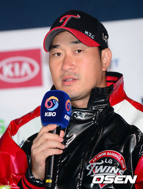 15일 오후 서울 잠실구장에서 진행된 '2013 한국야쿠르트 세븐 프로야구 플레이오프 미디어데이'에서 봉중근이 출사표를 던지고 있다.