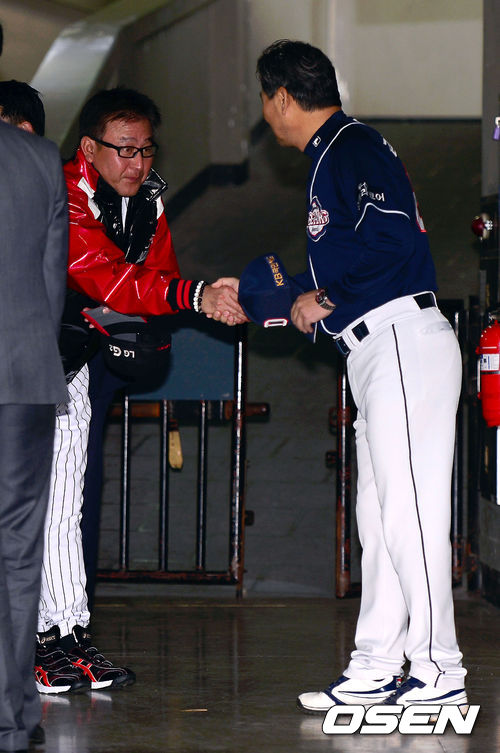 15일 오후 서울 잠실구장에서 진행된 '2013 한국야쿠르트 세븐 프로야구 플레이오프 미디어데이'에서 LG 김기태 감독과 두산 김진욱 감독이 악수를 나누고 있다.