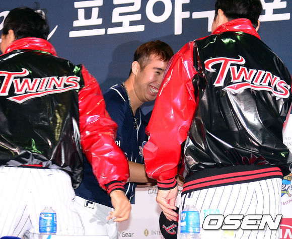15일 오후 서울 잠실구장에서 진행된 '2013 한국야쿠르트 세븐 프로야구 플레이오프 미디어데이'에서 두산 유희관이 LG 이병규, 봉중근과 장난을 치고 있다.