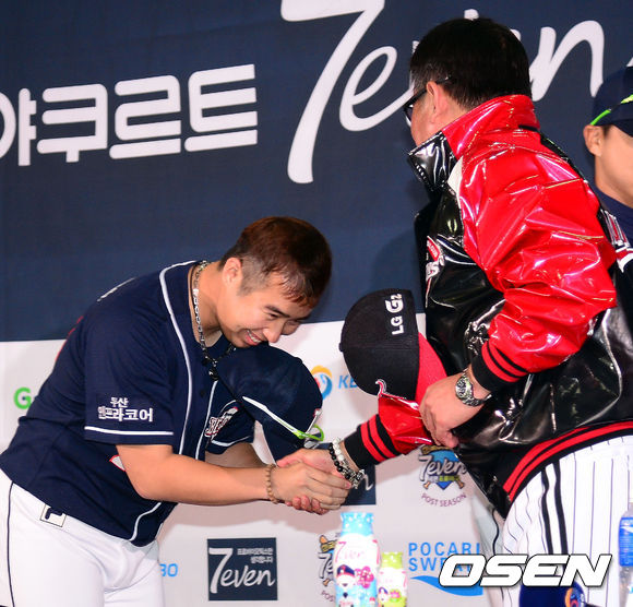 15일 오후 서울 잠실구장에서 진행된 '2013 한국야쿠르트 세븐 프로야구 플레이오프 미디어데이'에서 LG 김기태 감독과 두산 유희관이 악수를 하고 있다.