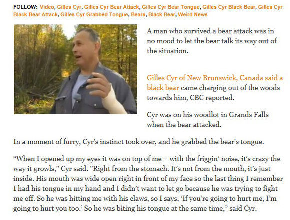 14일(한국시간) 미국일간지 '허핑턴포스트'에 따르면 한 남성이 곰의 습격에서 살아남았다. 캐나다 뉴브런즈윅주(州)에 사는 이 남성 질 시르는 산책 중 흑곰을 만났다. 곰은 다짜고짜 이 남자에게 달려들어 공격을 시작했다.