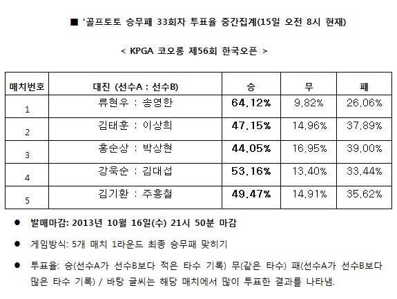 국민체육진흥공단(www.kspo.or.kr)이 발행하는 체육진흥투표권 수탁사업자인 스포츠토토 공식 온라인 발매 사이트인 베트맨(www.betman.co.kr)은 17일에 우정힐스CC에서 열리는 'KPGA 코오롱 제56회 한국오픈' 1라운드를 대상으로 한 승무패 33회차 게임 투표율을 중간 집계한 결과, 1번 매치에서 64.12%를 기록한 류현우가 26.06%%를 획득한 송영한보다 적은 타수의 1라운드 경기를 펼칠 것으로 예상했다고 밝혔다.