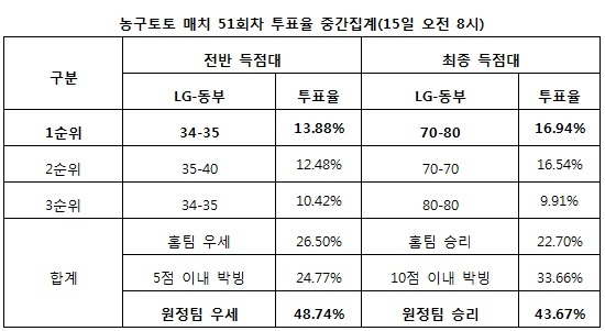 LG의 승리를 예상한 참가자는 22.70%에 머물렀고, 나머지 33.66%는 양 팀 10점 이내 박빙 승부를 전망했다.
