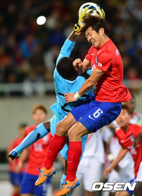 전반 한국 김영권이 말리 골키퍼와 헤딩 경합을 벌이고 있다.