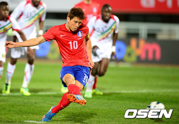 전반 한국 구자철이 페널티골을 성공시키고 있다.