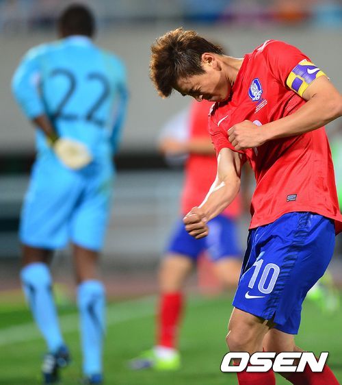 전반 한국 구자철이 동점 페널티킥 골을 넣고 환호하고 있다.