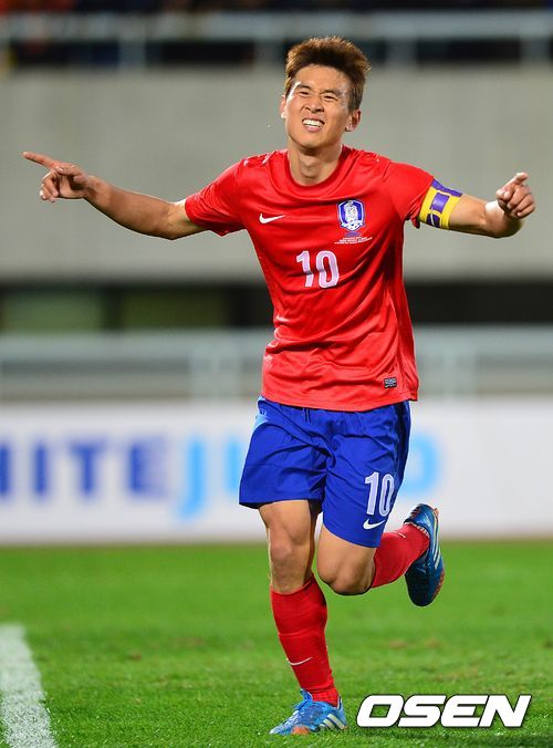 전반 한국 구자철이 동점 페널티킥 골을 넣고 환호하고 있다.