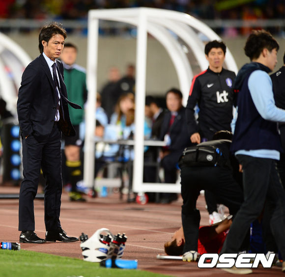 후반 한국 홍명보 감독이 태클에 걸려 부상당한 구자철을 걱정스런 표정을 바라보고 있다. 구자철은 김보경과 교체.