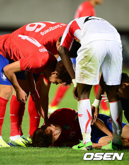후반 한국 구자철의 말리 수비수의 태클에 걸려 넘어지며 괴로워하고 있다. 구자철은 김보경과 교체.