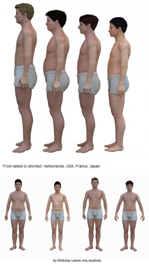 이 사진 통계에 따르면 미국, 프랑스, 네덜란드, 일본 중 미국 남성이 가장 건장하며 체질량 지수인 BMI(Body Mass Index)는 29, 평균키는 176.4cm, 허리둘레는 99.4cm다. 상대적으로 가장 작은 일본 남성은 건강 수준은 가장 좋은 것으로 드러났다. BMI 23.7로 정상 범주에 들었고 키는 171.4㎝, 허리는 82.9㎝이다.