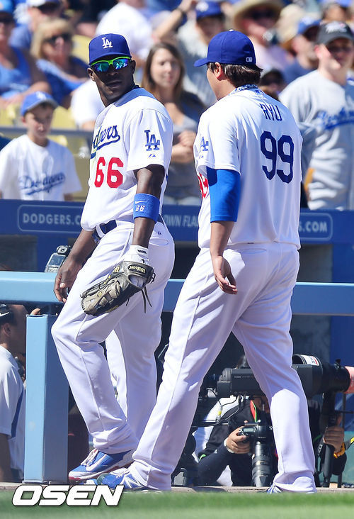 LA 다저스는 15일(이하 한국시간) 다저스타디움에서 열린 세인트루이스 카디널스와의 내셔널리그 챔피언십시리즈 3차전에서 선발로 나선 류현진의 7이닝 무실점 역투에 힘입어 3-0으로 이겼다. 여기에 1·2차전에서 도합 10타수 무안타로 침묵했던 또 하나의 ‘루키’ 야시엘 푸이그의 활약도 빼놓을 수 없는 승인이었다. 두 선수가 투·타에 활약한 다저스는 상대 에이스 카드 아담 웨인라이트를 무너뜨리며 기사회생했다.