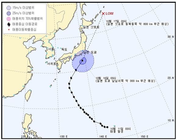 예상대로라면 이 태풍은 후쿠시마 원전사고 지역을 그대로 통과해 17일 새벽 3시경에는 일본 삿포로 동북동쪽 800km 해상을 지날 것으로 예상 되고 있다.