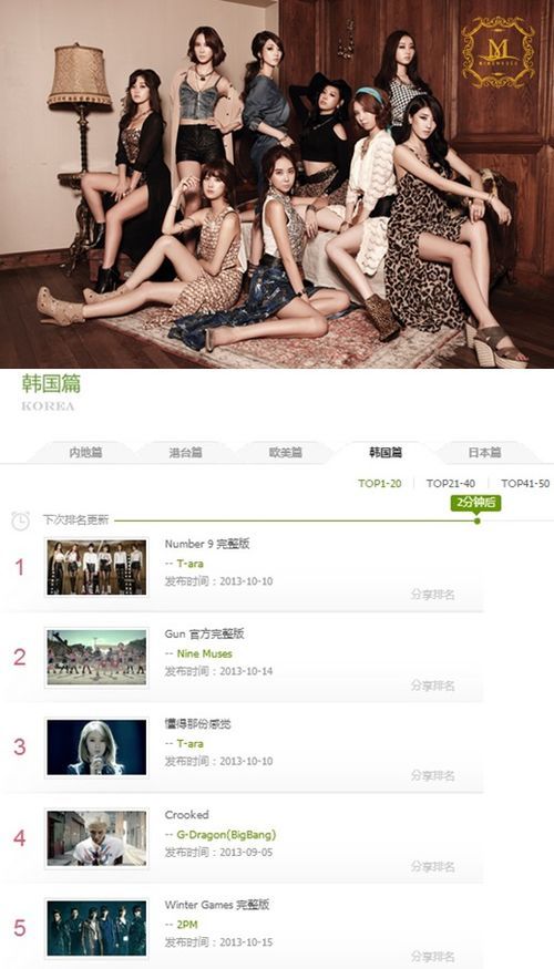 걸그룹 나인뮤지스의 신곡 '건(Gun)'이 한중 양국 차트의 상위권에 랭크되며 대세임을 입증했다.