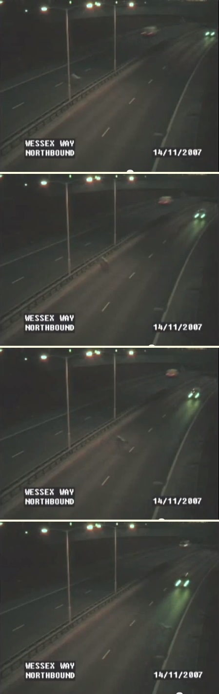 이 동영상 속 생명체는 영국의 한 고속도로를 그야말로 ‘빛의 속도’로 가로지른다. 왕복 4차선 고속도로는 밤 늦은 시간이라 통행 차량수는 드물었지만 간간이 지나가는 차량은 매우 빠른 속도로 달리고 있었다.