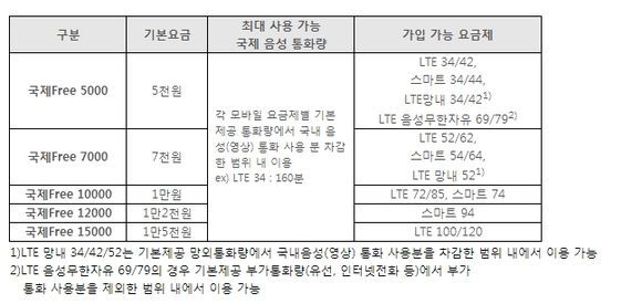 예를 들어 LTE72 이용고객이 ‘국제프리10000’에 가입하여 기본 음성통화 500분 중 250분을 미국에 거는 국제전화로 이용할 경우 모바일 기본료 7만 2000원과 부가서비스 월정액 1만원을 합해 월 8만 2000원을 부담하면 된다.
