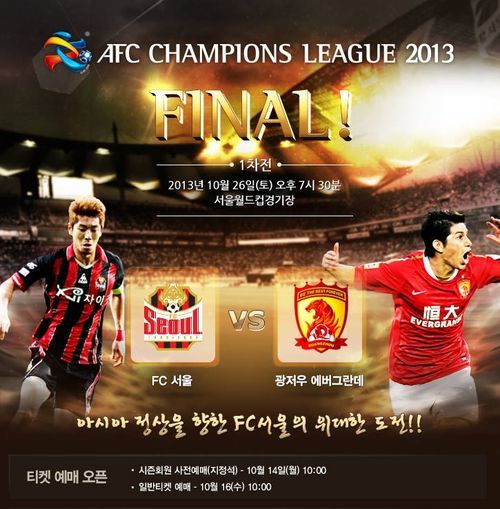 FC 서울의 아시아축구연맹(AFC) 챔피언스리그(이하 ACL) 결승전 홈경기의 예매가 10월 16일(수) 오전 10시부터 시작된다. FC 서울은 오는 26일(토) 저녁 19시 30분 서울월드컵경기장에서 중국의 광저우 에버그란데를 상대로 ACL 결승 1차전을 펼친다.