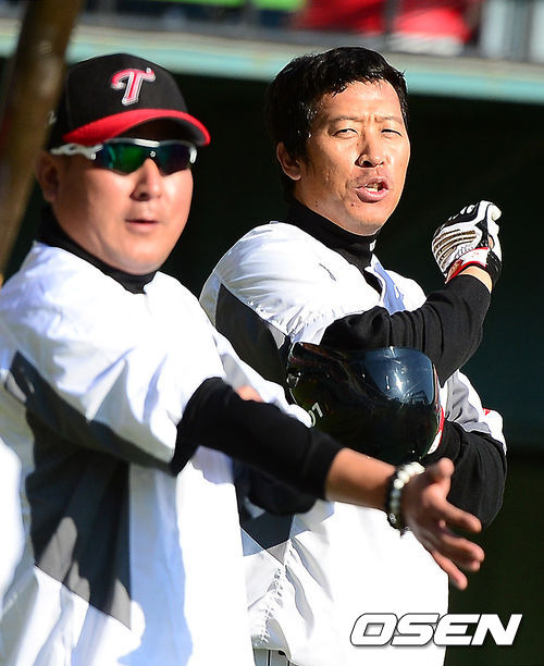 16일 오후 잠실구장에서 열리는 '2013 한국야쿠르트 세븐 프로야구' LG 트윈스와 두산 베어스의 플레이오프 1차전, 경기에 앞서 LG 김기태 감독이 이병규와 이야기를 나누고 있다.