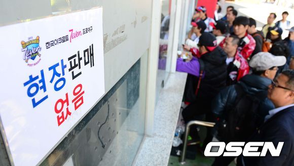 16일 오후 잠실구장에서 열린 '2013 한국야쿠르트 세븐 프로야구' LG 트윈스와 두산 베어스의 플레이오프 1차전, 경기에 앞서 팬들이 현장 판매소 오픈을 기다리고 있다.