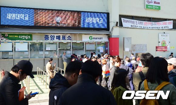 PO1,'현장 판매소 앞에 줄지어 서있는 야구팬들'