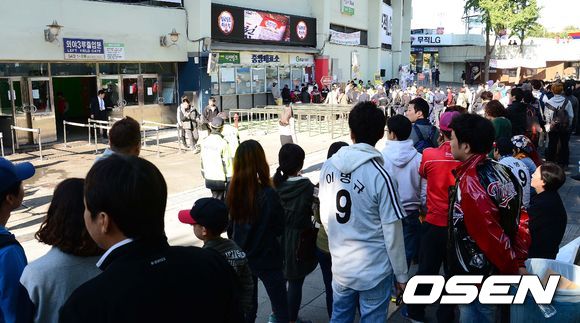 16일 오후 잠실구장에서 열린 '2013 한국야쿠르트 세븐 프로야구' LG 트윈스와 두산 베어스의 플레이오프 1차전, 경기에 앞서 팬들이 현장 판매소 오픈을 기다리고 있다.