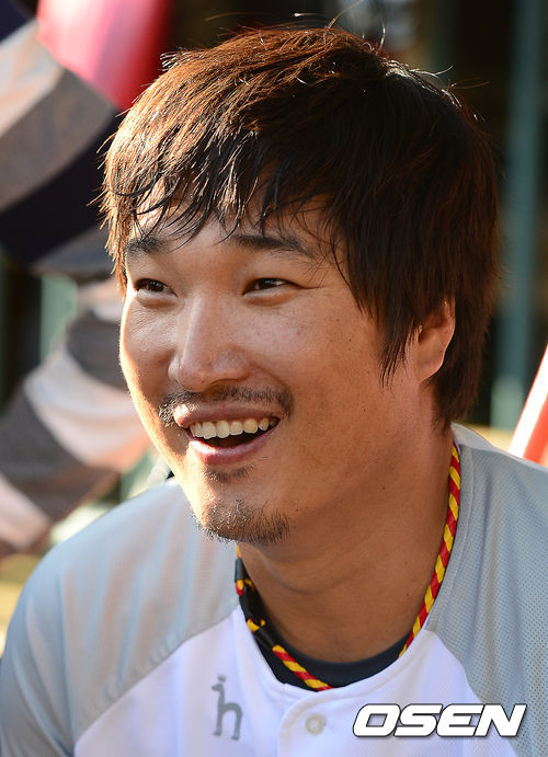 16일 오후 잠실구장에서 열리는 '2013 한국야쿠르트 세븐 프로야구' LG 트윈스와 두산 베어스의 플레이오프 1차전, 경기에 앞서 LG 이진영이 취재진과 이야기를 나누고 있다.