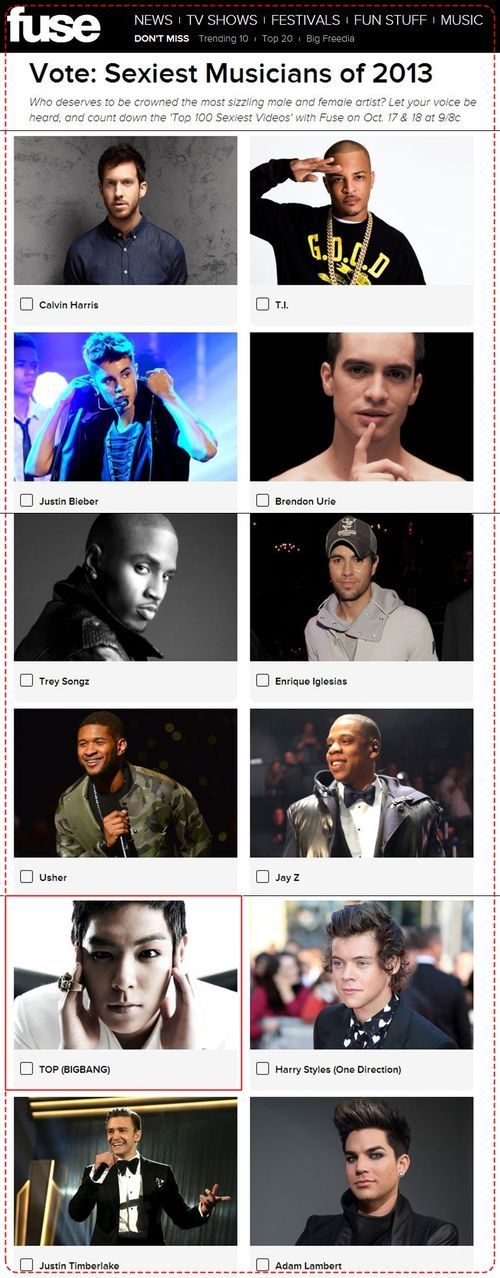 그룹 빅뱅의 탑이 미국 FUSE TV가 진행 중인 '2013 가장 섹시한 뮤지션' 투표에서 동양 스타 중 유일하게 후보에 이름을 올린 가운데, 현재 독보적으로 1위를 달리고 있다.