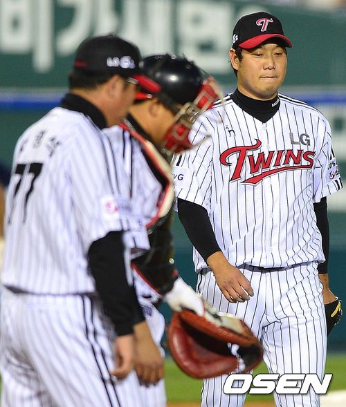 16일 오후 잠실구장에서 열린 '2013 한국야쿠르트 세븐 프로야구' LG 트윈스와 두산 베어스의 플레이오프 1차전, 1회초 두산 공격 무사 1, 3루 상황 3번 김현수에게 선제 1타점 적시타를 허용한 LG 선발 류제국이 아쉬워하고 있다.