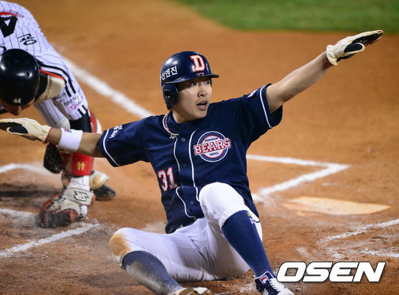 16일 오후 잠실구장에서 열린 '2013 한국야쿠르트 세븐 프로야구' LG 트윈스와 두산 베어스의 플레이오프 1차전, 1회초 무사 1,3루에서 두산 정수빈이 최준석의 3루땅볼에 홈에서 세이프되고 있다.