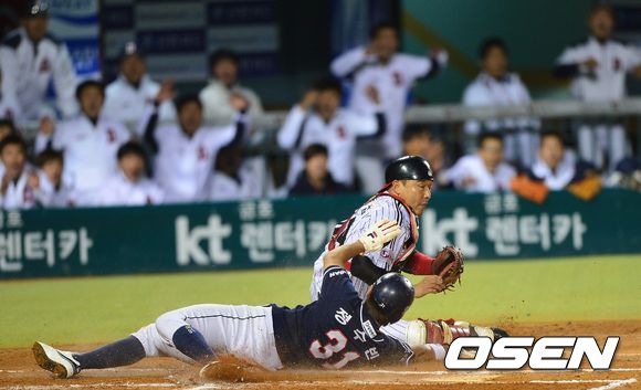 16일 오후 잠실구장에서 열린 '2013 한국야쿠르트 세븐 프로야구' LG 트윈스와 두산 베어스의 플레이오프 1차전, 1회초 두산 공격 무사 1, 3루 상황 4번 최준석의 3루수 땅볼 때 LG 3루수 정성훈의 악송구로 3루주자 정수빈이 세이프되고 있다.