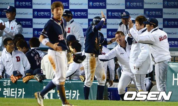 16일 오후 잠실구장에서 열린 '2013 한국야쿠르트 세븐 프로야구' LG 트윈스와 두산 베어스의 플레이오프 1차전, 1회초 무사 1,3루 두산 김현수의 좌전 적시타 때 홈을 밟은 3루주자 이종욱이 덕아웃에서 동료들과 하이파이브를 하고 있다.