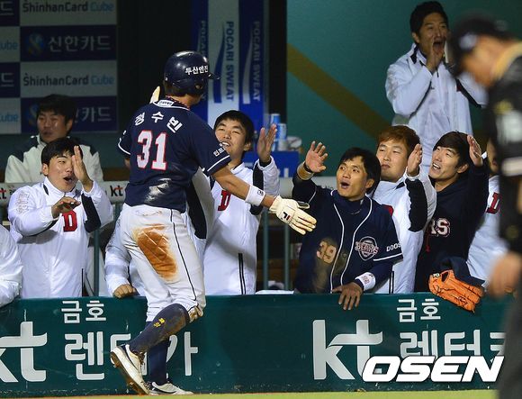 16일 오후 잠실구장에서 열린 '2013 한국야쿠르트 세븐 프로야구' LG 트윈스와 두산 베어스의 플레이오프 1차전, 1회초 두산 공격 무사 1, 3루 상황 4번 최준석의 3루수 땅볼 때 LG 3루수 정성훈의 악송구로 3루주자 정수빈이 세이프된 뒤 더그아우웃 동료들과 인사를 나누고 있다.