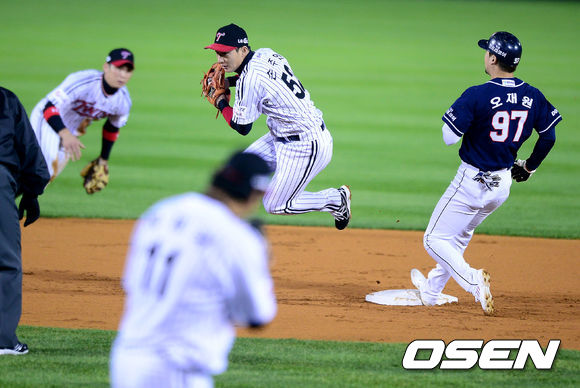 16일 오후 잠실구장에서 열린 '2013 한국야쿠르트 세븐 프로야구' LG 트윈스와 두산 베어스의 플레이오프 1차전, 1회초 2사 만루에서 LG 손주인이 두산 최재훈의 유격수땅볼에 오재원을 포스아웃시키고 있다.