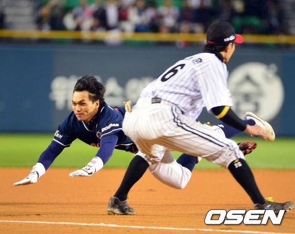 16일 오후 잠실구장에서 열린 '2013 한국야쿠르트 세븐 프로야구' LG 트윈스와 두산 베어스의 플레이오프 1차전, 1회초 선두타자로 나선 이종욱이 3루타를 치고 3루에 안착하고 있다.