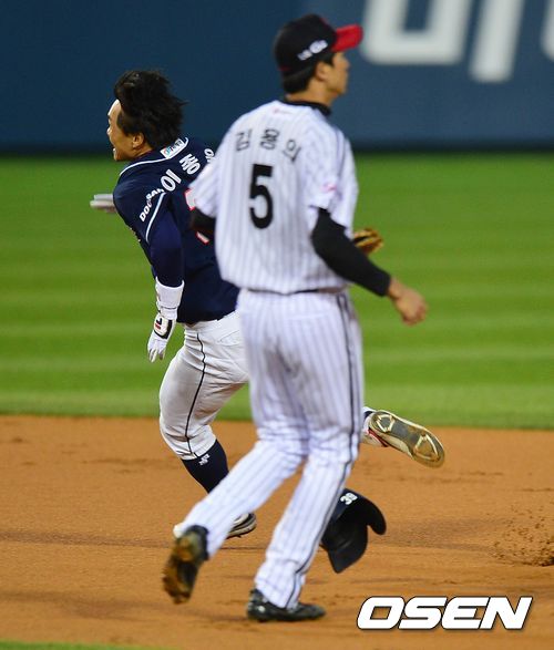 16일 오후 잠실구장에서 열린 '2013 한국야쿠르트 세븐 프로야구' LG 트윈스와 두산 베어스의 플레이오프 1차전, 1회초 두산 공격 선두타자로 나선 이종욱이 우중간을 가르는 3루타를 날리고 3루로 전력질주 하고 있다.