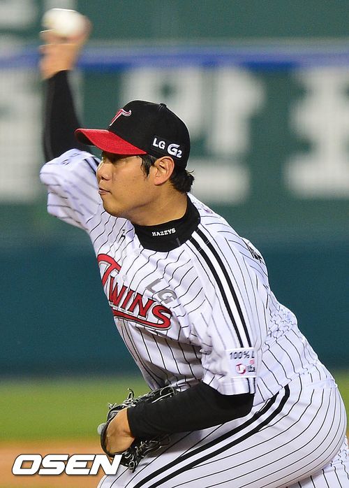 16일 오후 잠실구장에서 열린 '2013 한국야쿠르트 세븐 프로야구' LG 트윈스와 두산 베어스의 플레이오프 1차전, LG 선발 류제국이 힘차게 공을 뿌리고 있다.