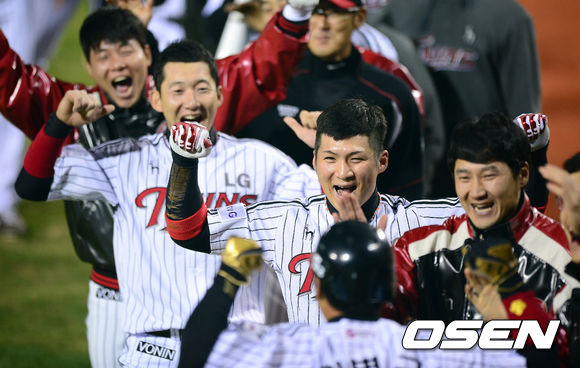 16일 오후 잠실구장에서 열린 '2013 한국야쿠르트 세븐 프로야구' LG 트윈스와 두산 베어스의 플레이오프 1차전, 1회말 무사 1루에서 LG 이병규가 투런 동점포를 날리고 더그아웃에서 동료선수들과 기뻐하고 있다.