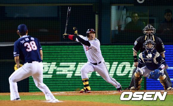 16일 오후 잠실구장에서 열린 '2013 한국야쿠르트 세븐 프로야구' LG 트윈스와 두산 베어스의 플레이오프 1차전, 1회말 무사 1루에서 LG 이병규가 좌월 투런 홈런을 치고 있다.