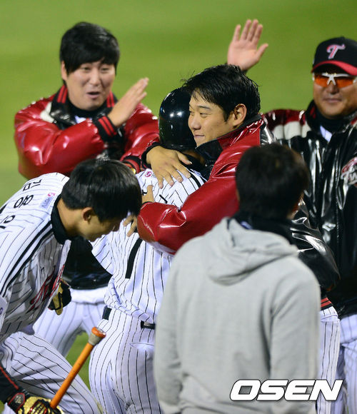 16일 오후 잠실구장에서 열린 '2013 한국야쿠르트 세븐 프로야구' LG 트윈스와 두산 베어스의 플레이오프 1차전, 1회말 무사 1루에서 LG 이병규가 투런 동점포를 날리고 더그아웃에서 동료선수들과 기뻐하고 있다.