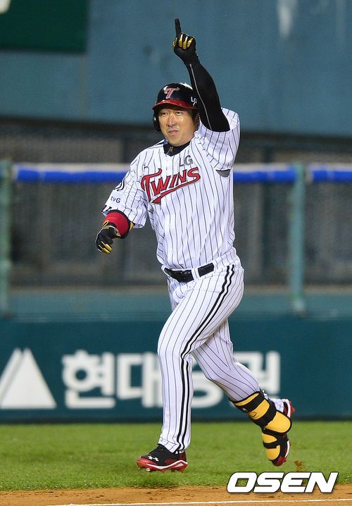 16일 오후 잠실구장에서 열린 '2013 한국야쿠르트 세븐 프로야구' LG 트윈스와 두산 베어스의 플레이오프 1차전, 1회말 LG 공격 무사 1루 상황 2번 이병규(7번)이 동점 좌월 투런포를 날리고 환호하며 그라운드를 돌고 있다.