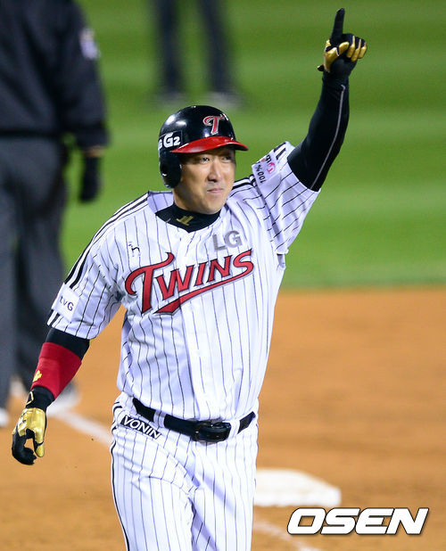 16일 오후 잠실구장에서 열린 '2013 한국야쿠르트 세븐 프로야구' LG 트윈스와 두산 베어스의 플레이오프 1차전, 1회말 무사 1루에서 LG 이병규가 투런 동점포를 날리고 그라운드를 돌며 기뻐하고 있다.
