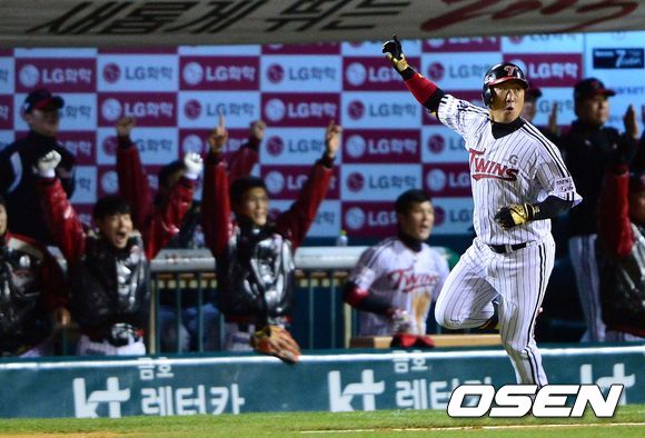 16일 오후 잠실구장에서 열린 '2013 한국야쿠르트 세븐 프로야구' LG 트윈스와 두산 베어스의 플레이오프 1차전, 1회말 무사 1루에서 LG 이병규가 좌월 투런 홈런을 치고 그라운드를 돌며 환호하고 있다.