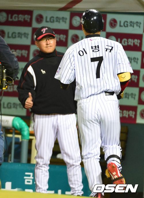 16일 오후 잠실구장에서 열린 '2013 한국야쿠르트 세븐 프로야구' LG 트윈스와 두산 베어스의 플레이오프 1차전, 1회말 무사 1루 이병규가 동점 투런 홈런을 치고 김기태 감독의 환영을 받고 있다.